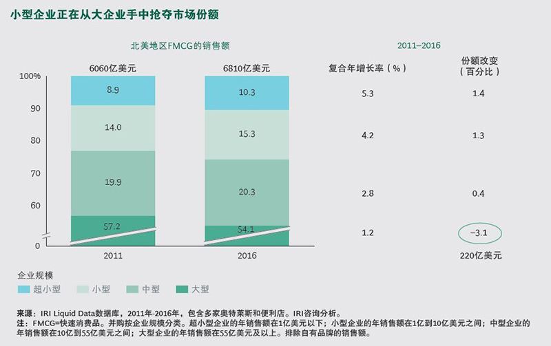 過(guò)去50年,跨國(guó)消費(fèi)品企業(yè)強(qiáng)化品牌、擴(kuò)展產(chǎn)品組合、穩(wěn)步提高市場(chǎng)占有率和收入,創(chuàng)造了強(qiáng)大的股東價(jià)值。那曾是大媒體、大零售商、大品牌的時(shí)代。大約五年前,規(guī)模較小的企業(yè)和品牌首次開(kāi)始瓜分大品牌的蛋糕。在2011年到2016年間,北美地區(qū)大約220億美元的行業(yè)銷(xiāo)售從大企業(yè)轉(zhuǎn)移到小企業(yè)。歐洲也經(jīng)歷了同樣的改變。