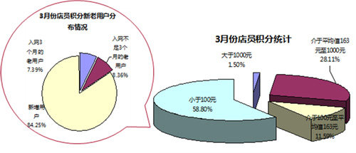 從圖可發現,實體網點1千多家,3月份獲得酬金的只有465家,未獲積分酬金的網點數量不少。在有積分酬金的網點中,約70%的網點增值業務傭金低于平均水平163元。而酬金獲取多的主要集中在少數幾個網點。表明:增值業務開展量主要集中在少數網點,遠未形成渠道的整體能力。