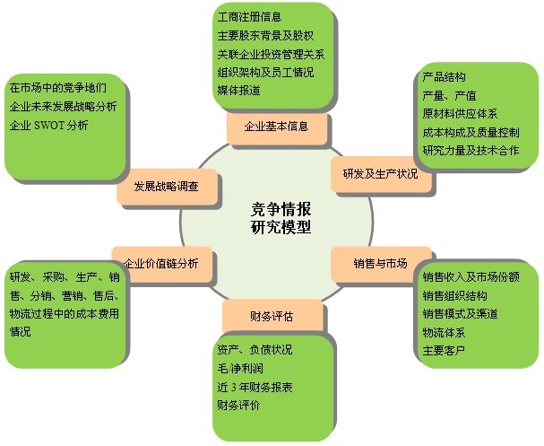 競爭情報研究是關(guān)于競爭環(huán)境、競爭對手和競爭策略的調(diào)查研究,是根據(jù)客戶的要求,通過合法手段,針對特定行業(yè)的競爭對手企業(yè)或潛在競爭情況進行的調(diào)研。競爭情報研究是一種系統(tǒng)的、合法的研究活動;是一種產(chǎn)品和服務(wù),研究關(guān)注的重點是企業(yè)外部那些影響企業(yè)戰(zhàn)略和策略決策的因素。